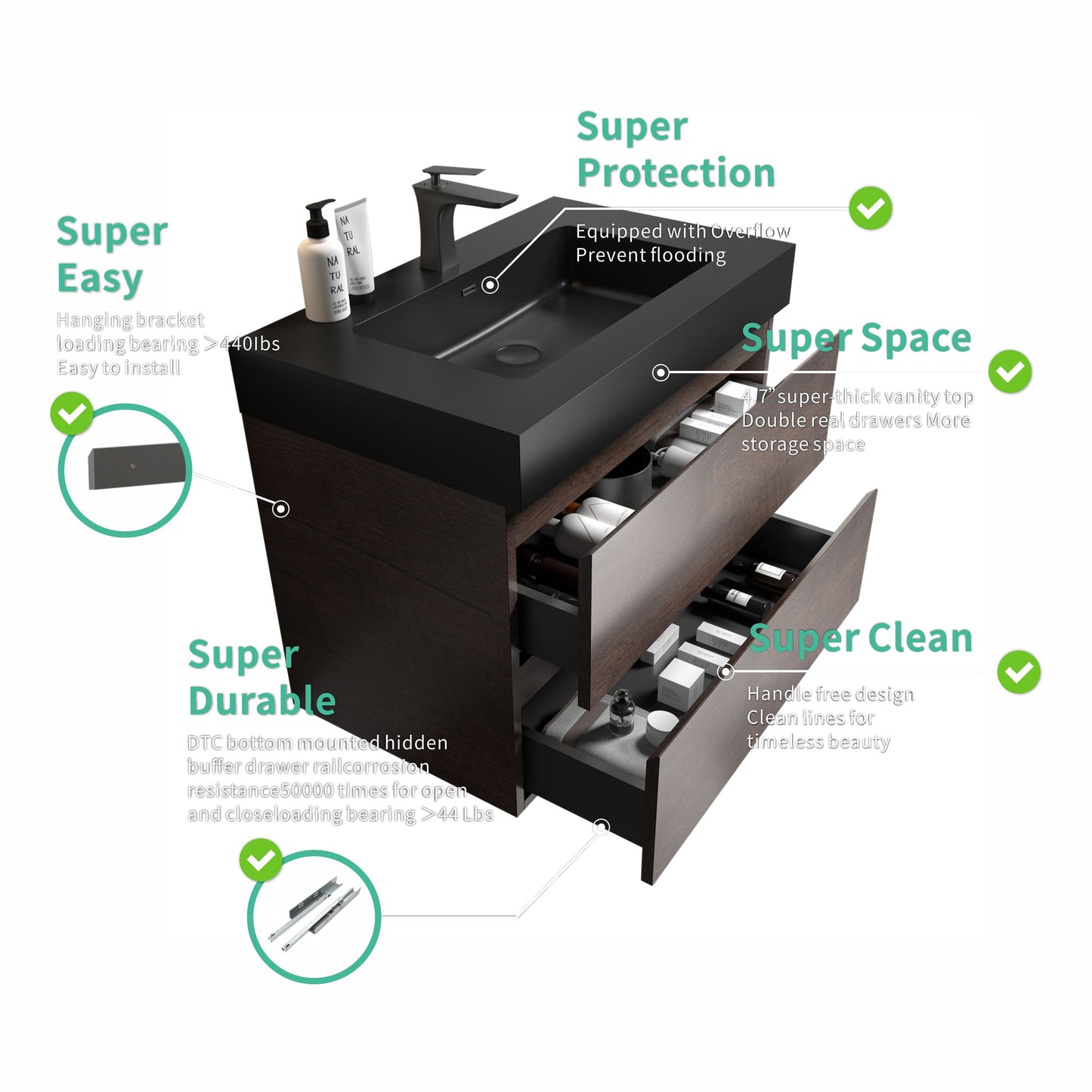 - Maximize your bathroom storage with a large wall-mounted vanity featuring double soft-closing drawers, keeping clutter at bay for a clean and organized space.