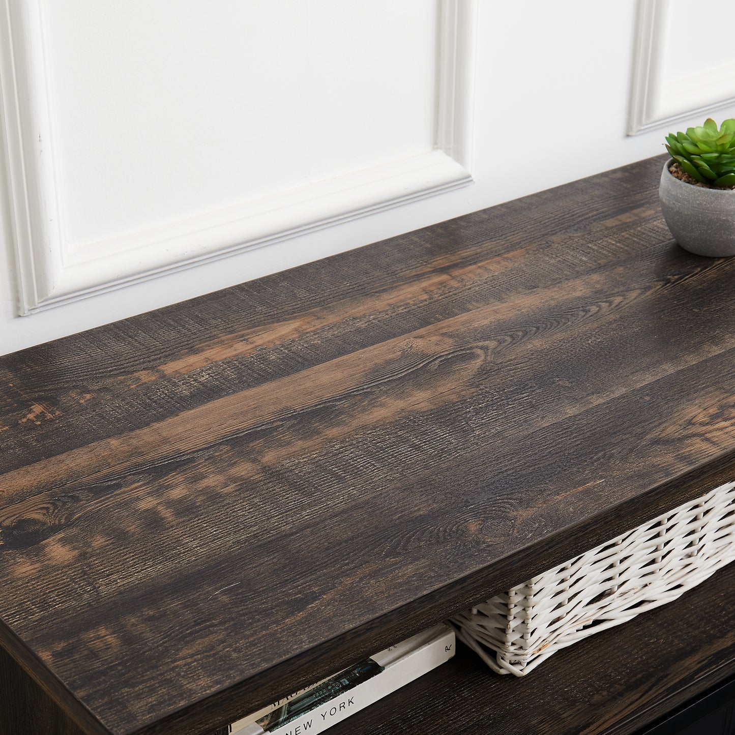 Finished in a beautiful antique brown color, this console emanates a classic charm. It features multiple built-in shelves and storage cabinets, offering flexible organization options for all your gadgets.