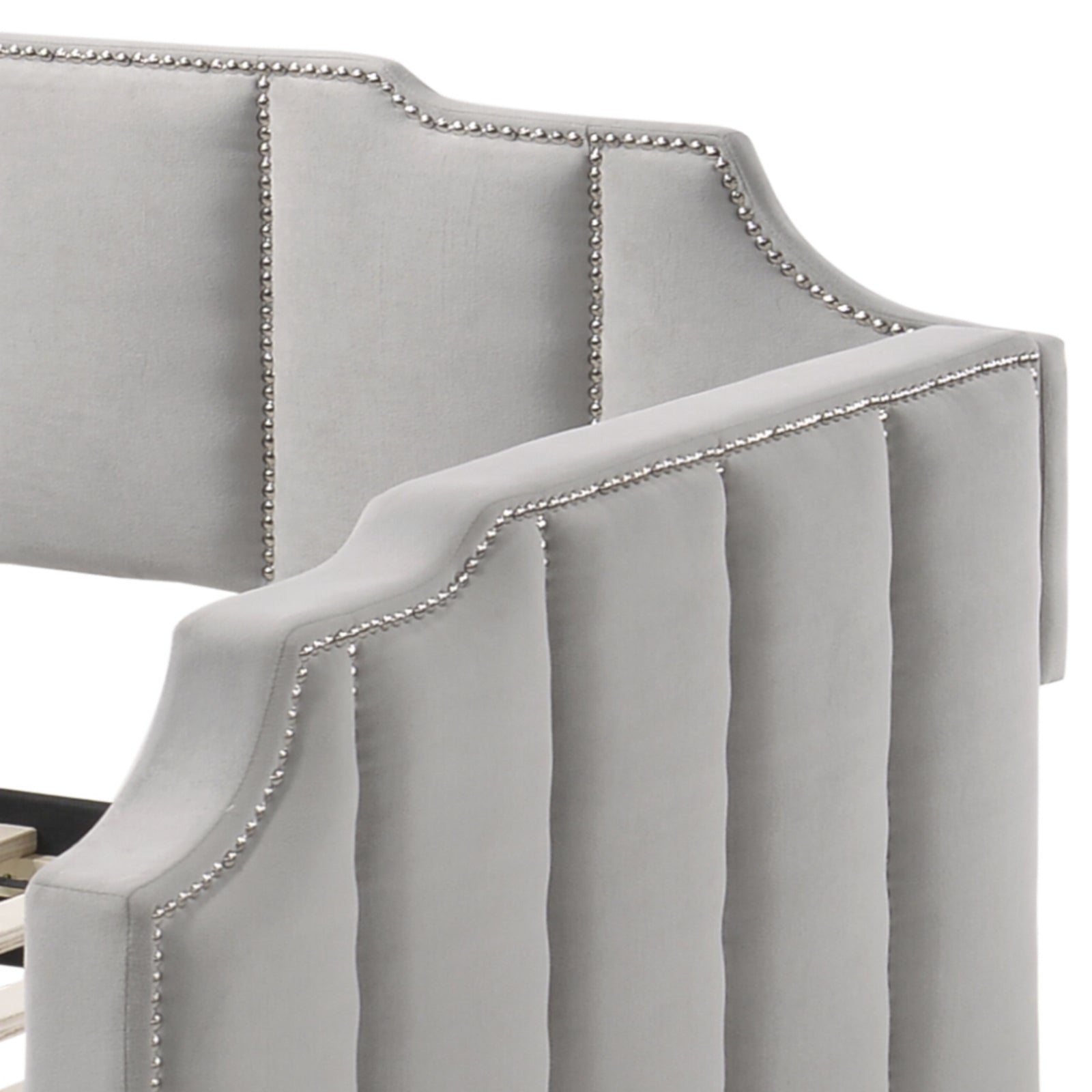 The daybed features a fully padded design with a sloped back and side panels, paired with horizontal tufting and nailhead trim, making it both beautiful and comfortable. The 28-slat support system eliminates the need for a box spring, ensuring a streamlined setup.