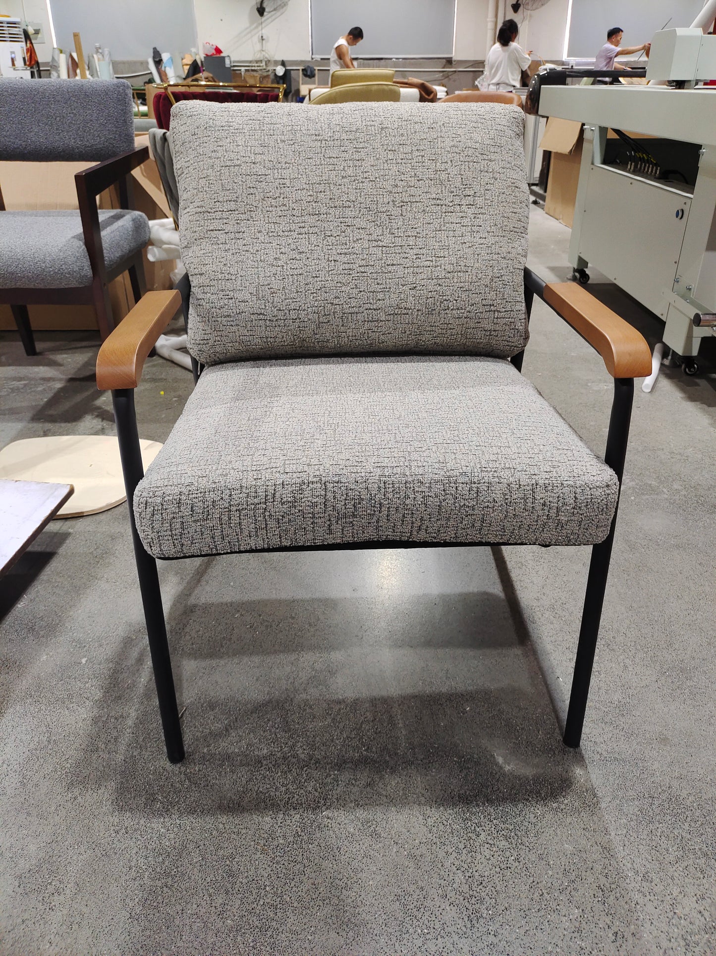 - Enhance your space with a stylish accent chair featuring a sleek metal frame and natural wood armrests, perfect for any living room or bedroom setup.