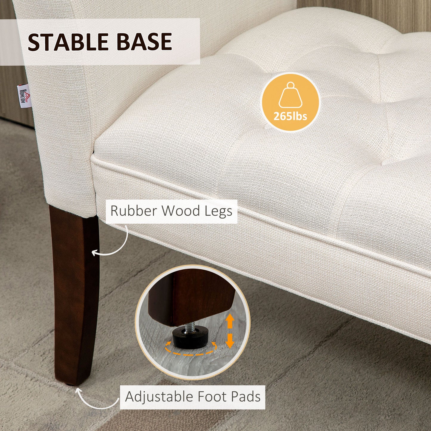 This bench features a button-tufted cushion and soft arms, providing a traditional look and comfortable support. The cream white color blends seamlessly with various interior styles, while the thick foam padding ensures a pleasant seating experience.