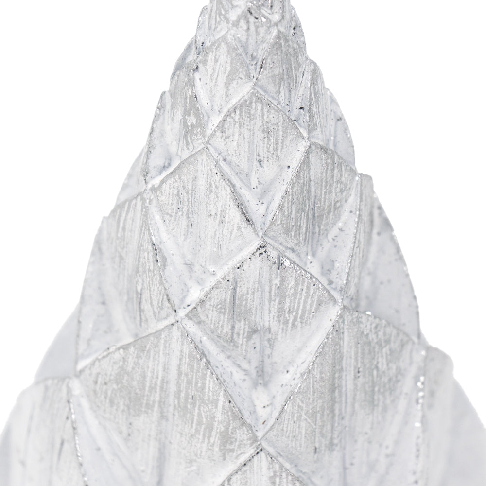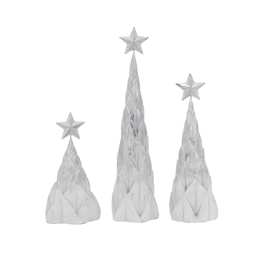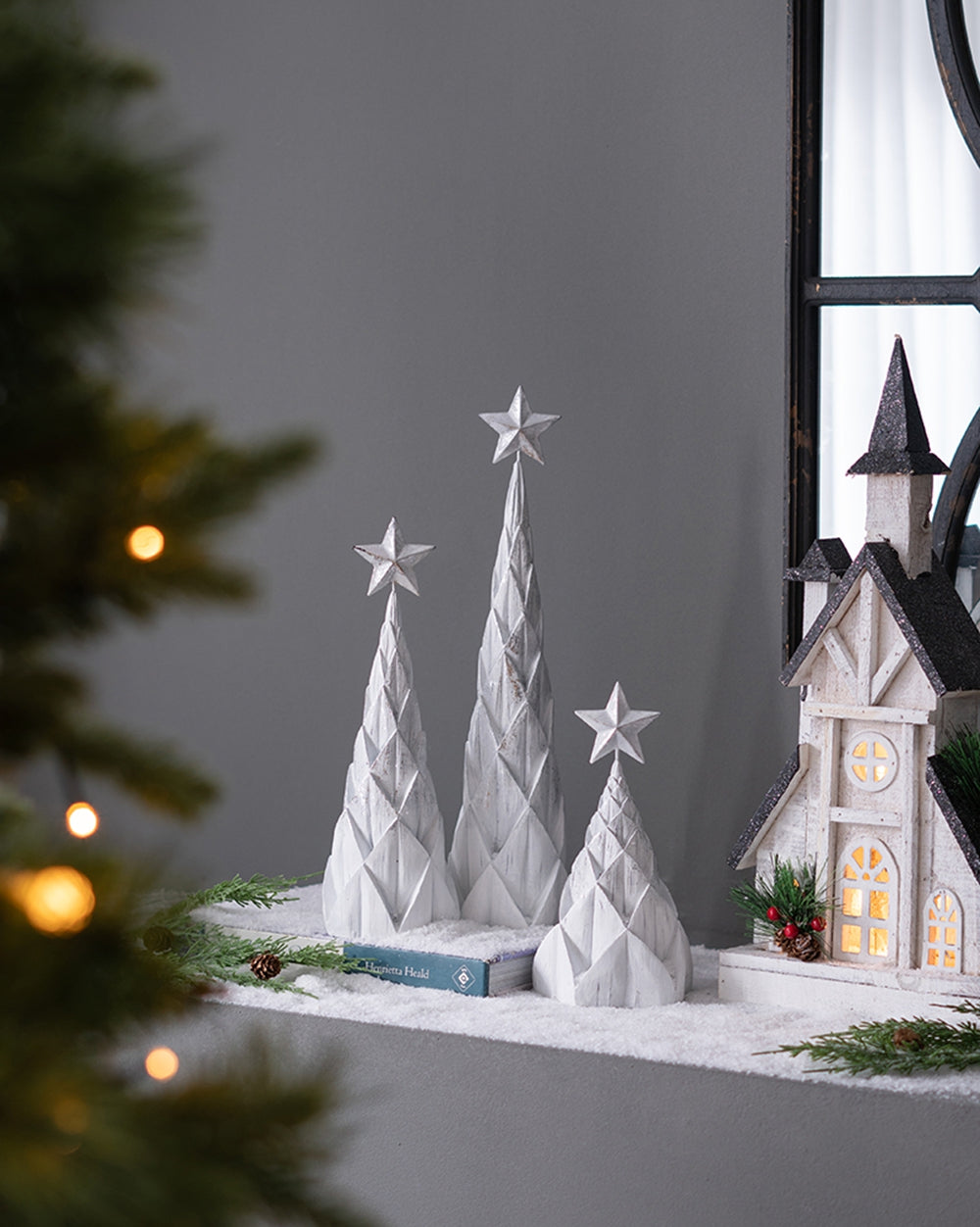 This set includes three unique sizes of white resin tree figurines, each adorned with a shimmering silver foil finish and a stylish star topper. Use them to create a cohesive, modern winter display on shelves or tables.