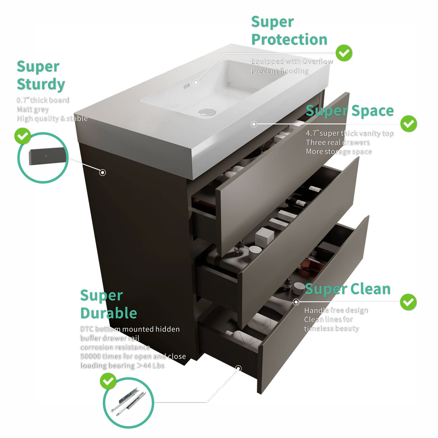 This vanity features a sleek gray finish that complements any contemporary bathroom decor. The integrated white sink is not only stylish but is crafted for durability, with zero permeability and abrasion resistance, ensuring it maintains its appearance over time.