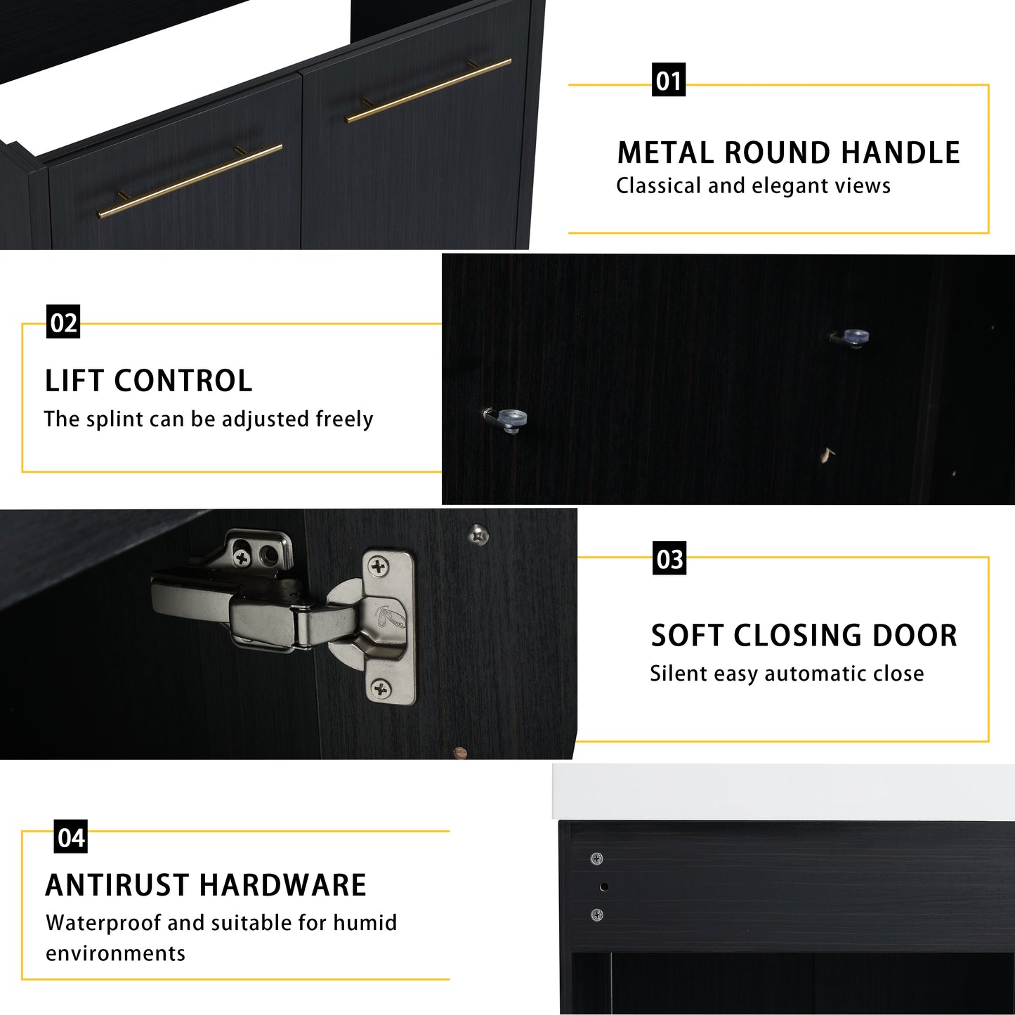 Constructed from durable plywood with a black chestnut finish, this vanity features soft closing door hinges that allow for quiet use. Its scratch and water-resistant melamine surface ensures ease of maintenance while protecting against moisture, making it a practical choice for any bathroom.