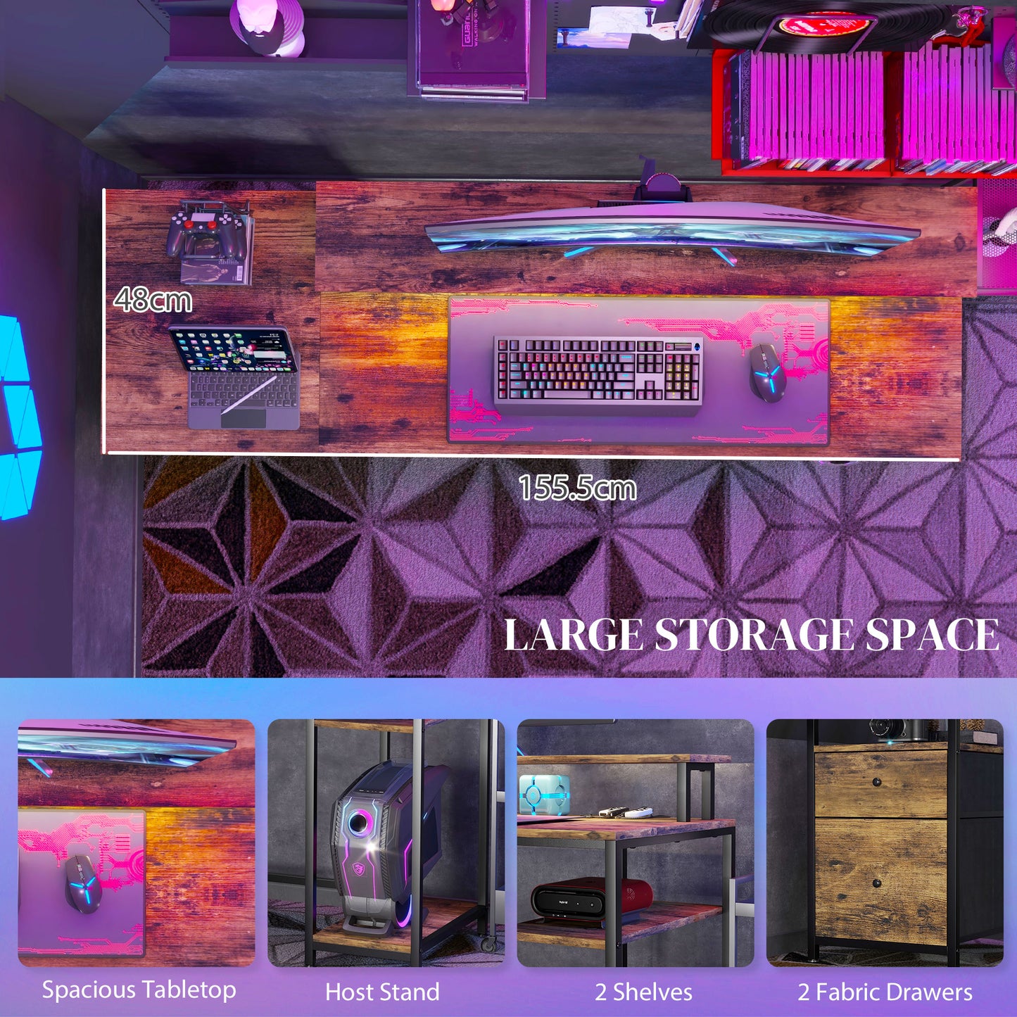 Organization and Power in One: 61-Inch Computer Desk with LED Lights, USB Ports, and Storage Shelves