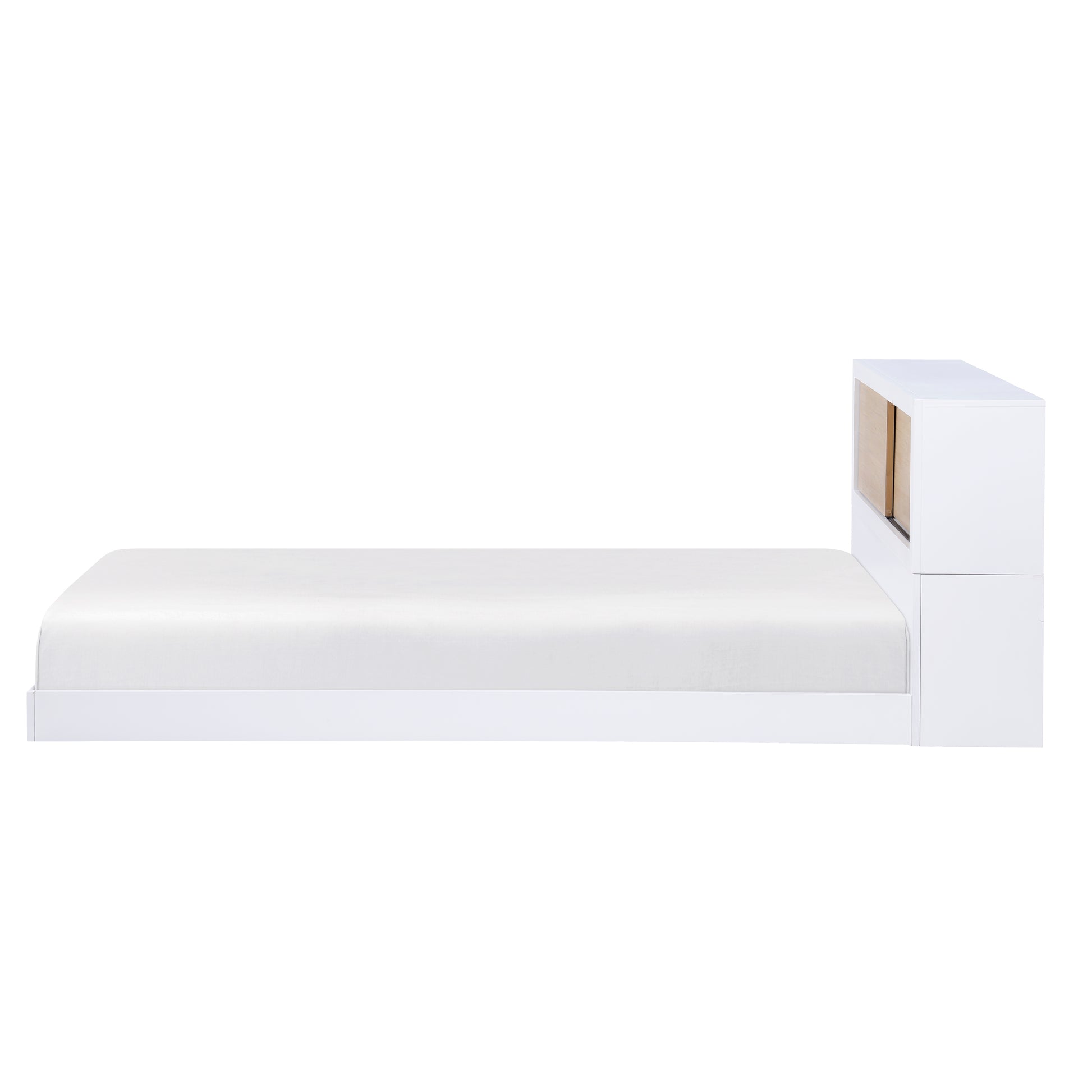 Featuring a stylish two-tone white and natural finish, this bed complements any decor while offering functionality with its sliding door bookcase headboard. The headboard also includes USB ports for modern convenience.