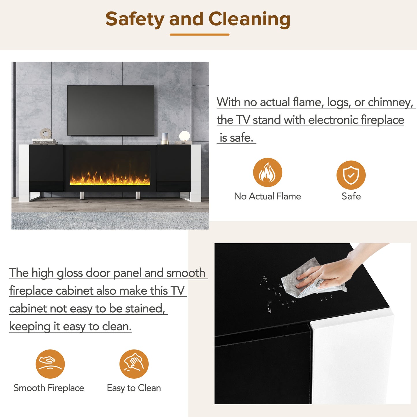Stylish Modern TV Stand with Electric Fireplace & Cabinets - Black