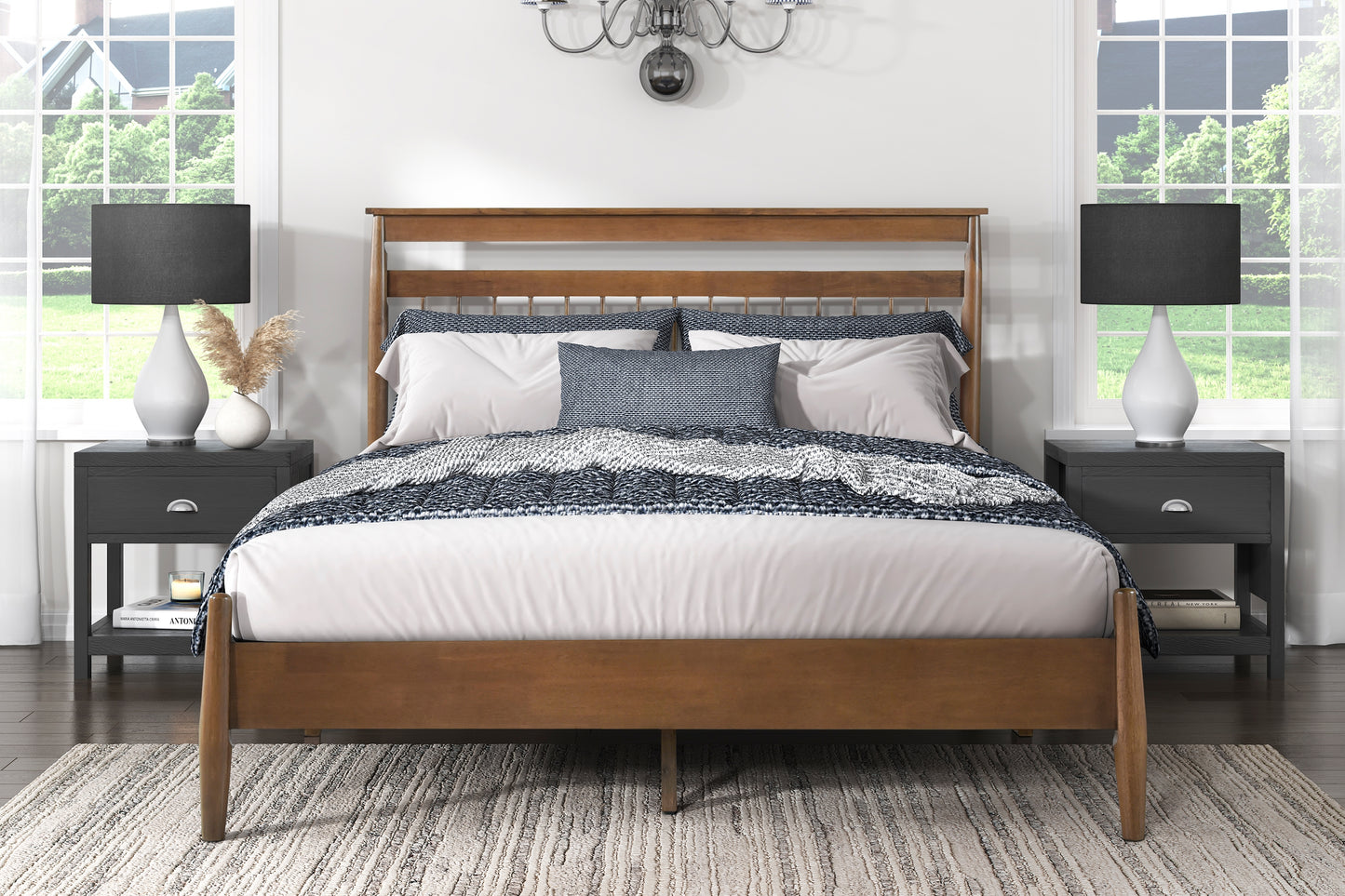 The platform bed comes equipped with a headboard, footboard, rails, and slats conveniently packaged in one box, making setup easy. Its classic chestnut wood frame not only allows versatility in décor but also enhances the overall ambiance of your room.