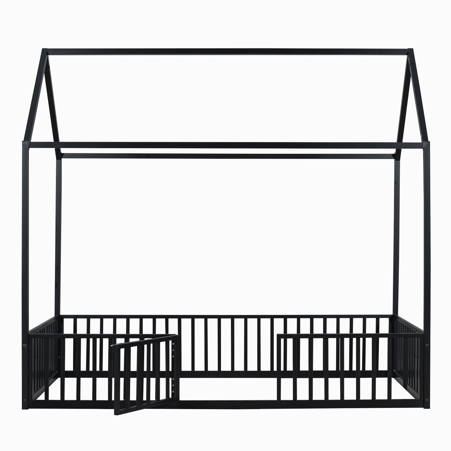Twin Size Metal House Bed with Fence and Door - Black Color